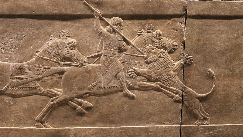 Uno dei cicli scultorei più belli riguarda la decorazione del palazzo nord di Ninive. Rappresenta la caccia al leone del re Assurbanipal. Attenzione, la caccia non avveniva davvero, ma era in realtà un’antica corrida svolta in un recinto dove le vittime erano i leoni e il protagonista assoluto, supportato da altri cacciatori, era il re che dava dimostrazione di forza, al pubblico, uccidendo l’animale più potente di tutti.