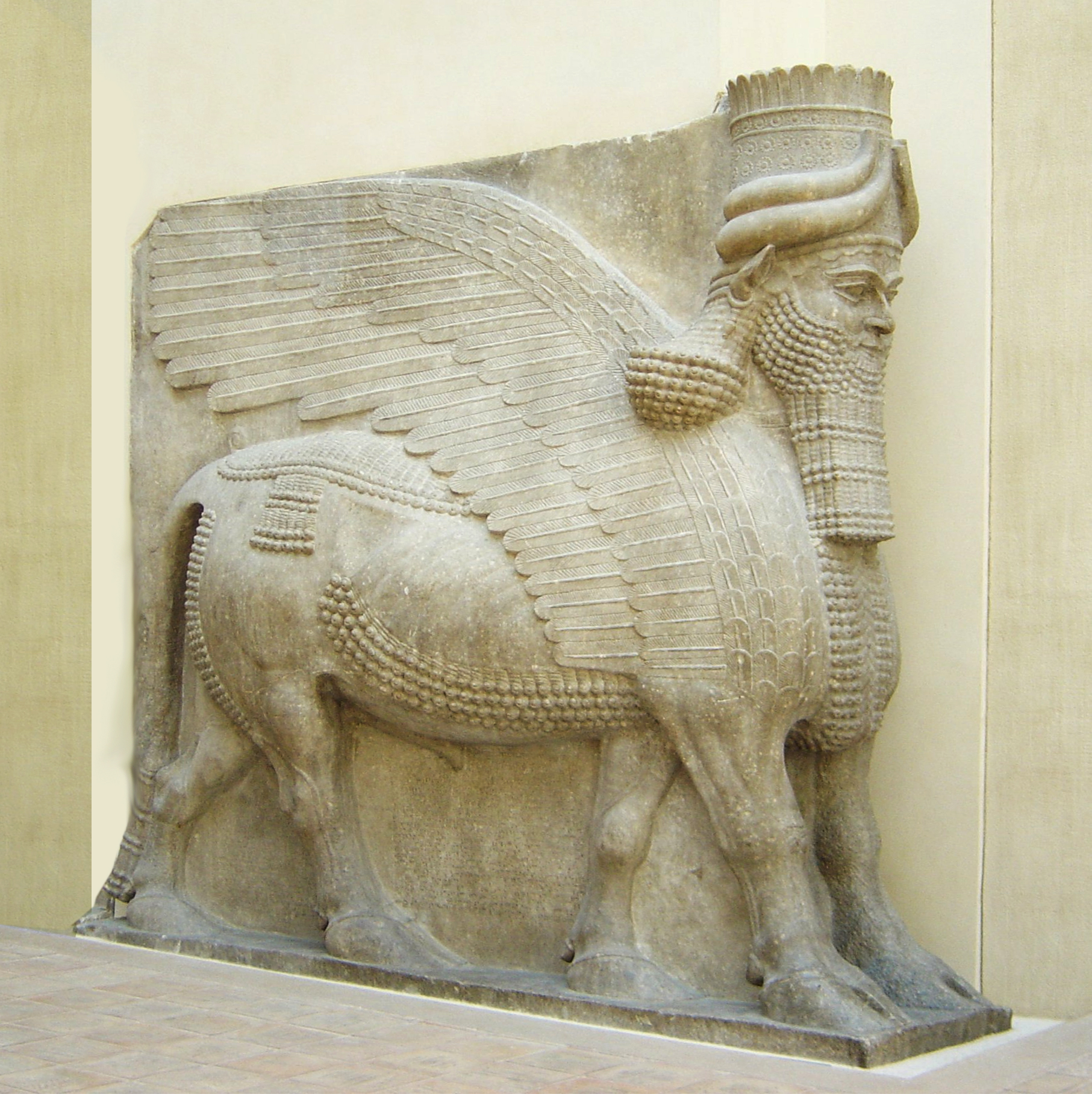 Altro esempio molto scenografico è la scultura del Lamassu. Un toro alato con la testa di uomo che aveva la funzione di proteggere la città. Molto spesso sotto le pance di queste creature venivano incise le leggi e, non a caso, erano realizzati per essere inglobati alle porte di ingresso della città. Erano figure gigantesche, realizzate in alabastro e alte tre-quattro metri. Inoltre avevano un particolare curioso. Se si osservano attentamente sembravano avere una quinta gamba sotto l’addome. Questa serviva per dare l’impressione del movimento, infatti: chi vedeva il rilievo del Lamassu di fianco, lo vedeva camminare; quando l’osservatore si trovava di fronte, le gambe erano ferme. Chi si avvicinava alla città in pratica era seguito dalla legge portata dal Lamassu, e doveva stare molto attento.